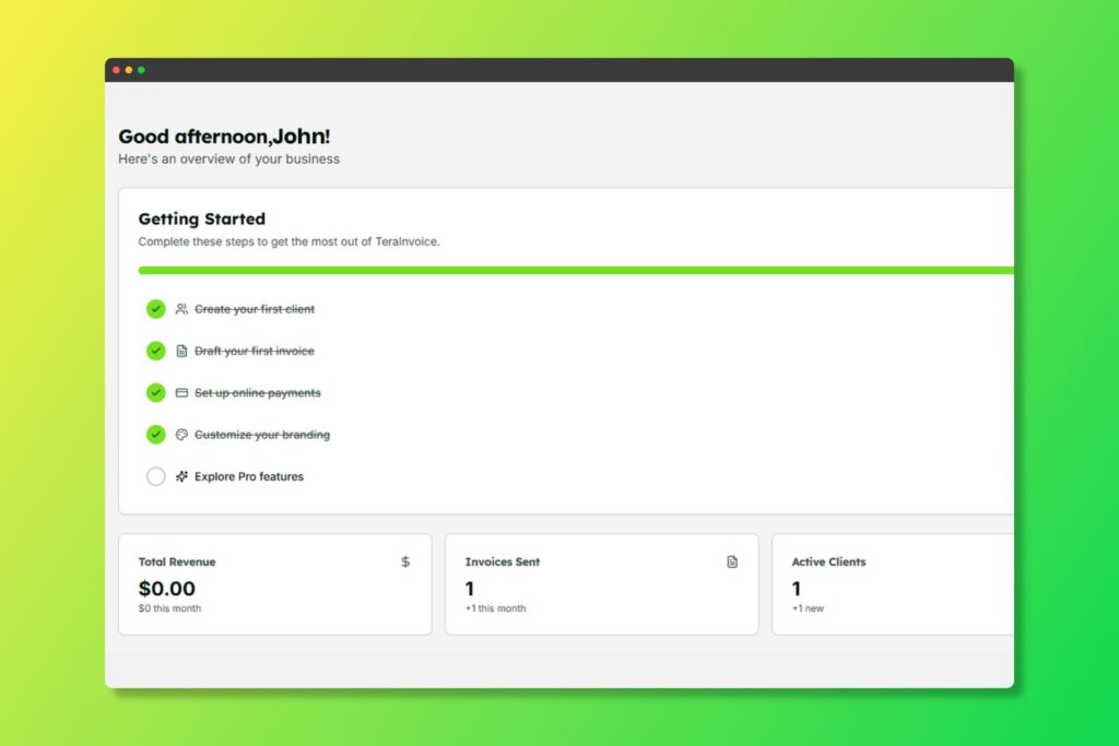 Your TeraInvoice dashboard with key metrics and revenue chart