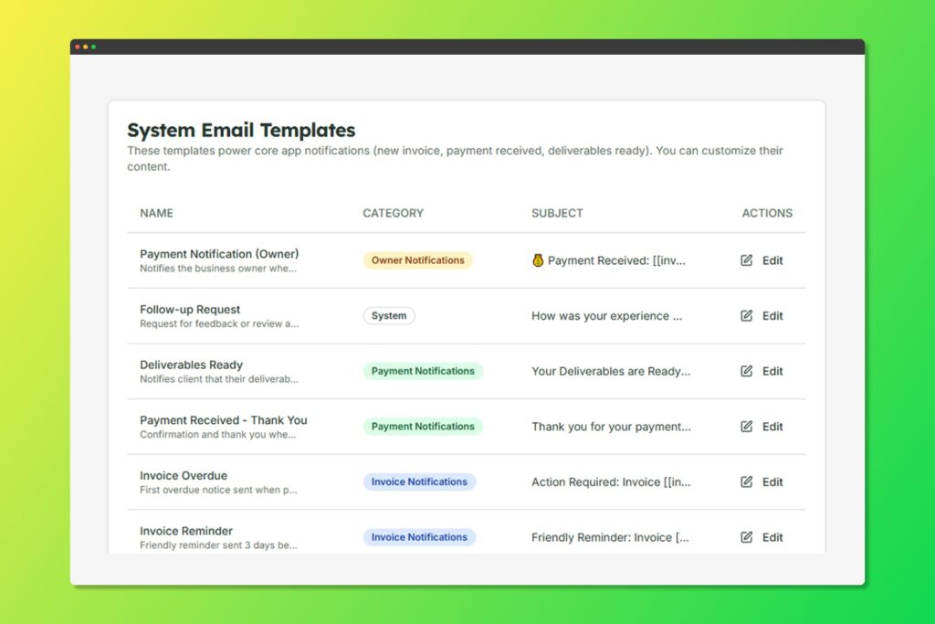 - These templates power core app notifications (new invoice, payment received, deliverables ready). You can customize their content.